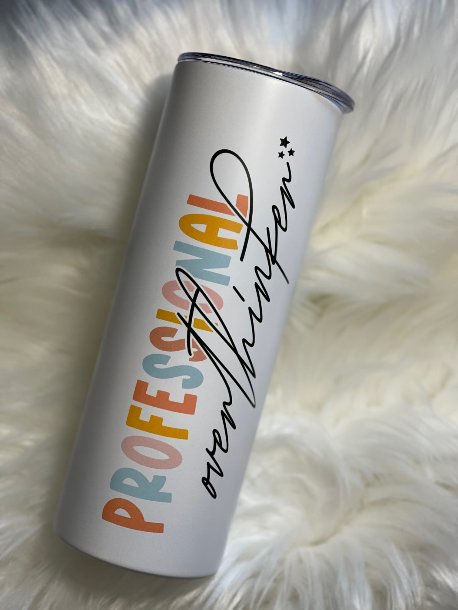 Know someone who overanalyzes everything (including this purchase)? This 20 oz straight stainless steel sublimation tumbler proudly declares “Professional Overthinker.” A fun, relatable gift that keeps drinks hot or cold while validating their inner monologue.
