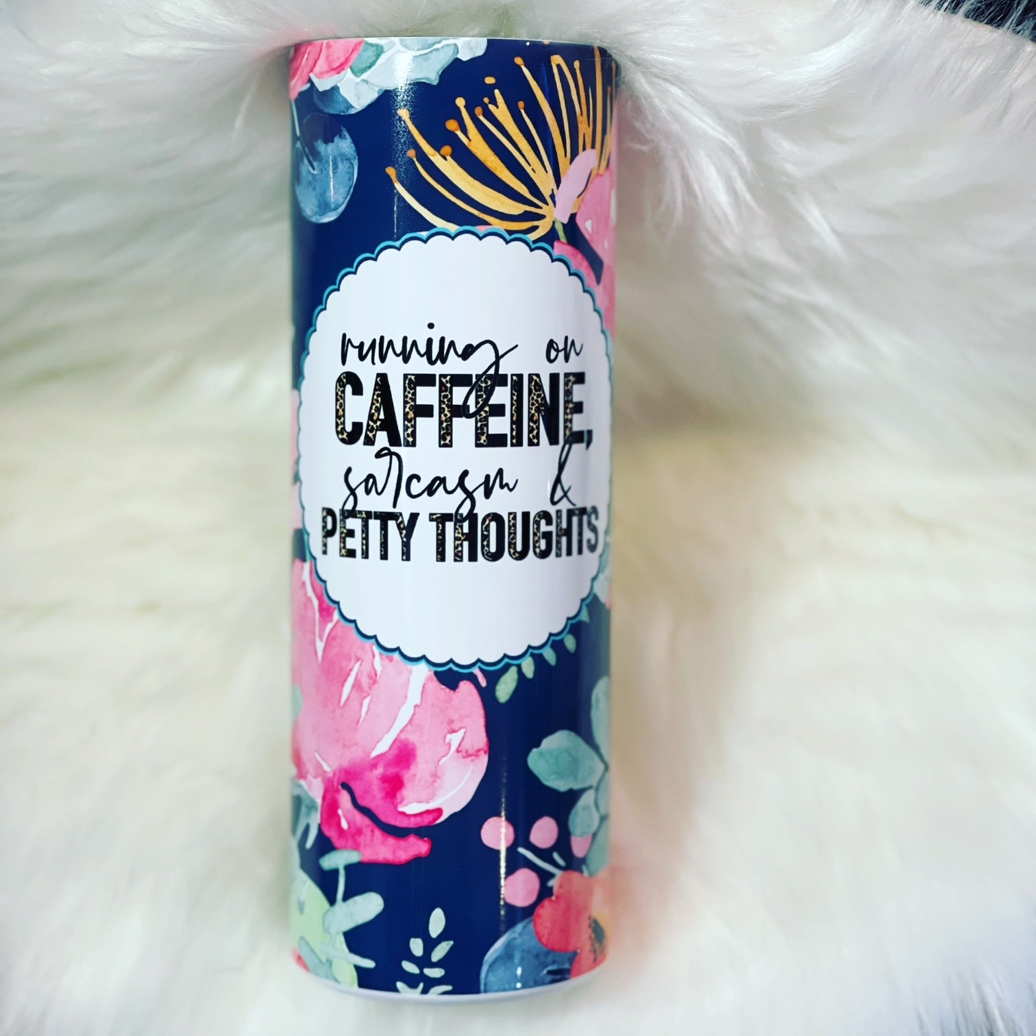 Fuel your day properly. This 20 oz straight stainless steel tumbler features the phrase “Running on caffeine, sarcasm, and petty thoughts” for those who thrive on coffee and quick wit. Durable, insulated, and made for everyday use.